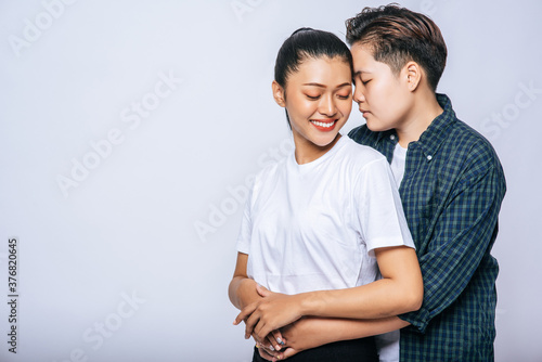 Two female lovers standing and hugging from behind.