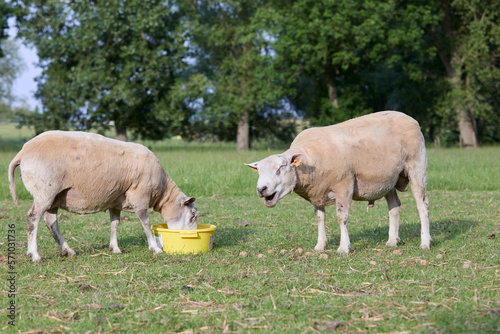 Two Flemish sheep in meadow eating