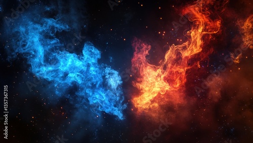 blue, red, orange, smoke, fire, colours, contrast, aethereal, celestial, cosmic, energy, light, dark, abstract, space, galaxy, star, particle, glowing, cloud, fluid, motion, burning, airy, dreamlike, vibrant, flames, warmth, coolness, texture, pattern, shape, form, wispy, soft, artistic, dynamic, visual, design, wallpaper, effect, fantasy, imagination, creative, nebulous, spreaded, background