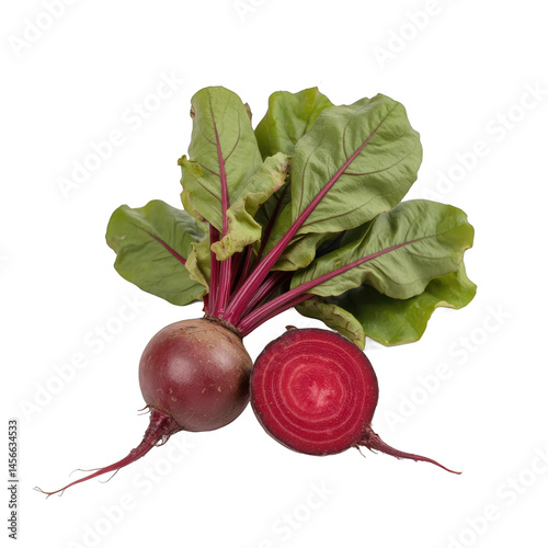 Two fresh radishes with vibrant red skin and leafy green tops, ideal for healthy food themes and recipe designs. Isolated on white background or PNG