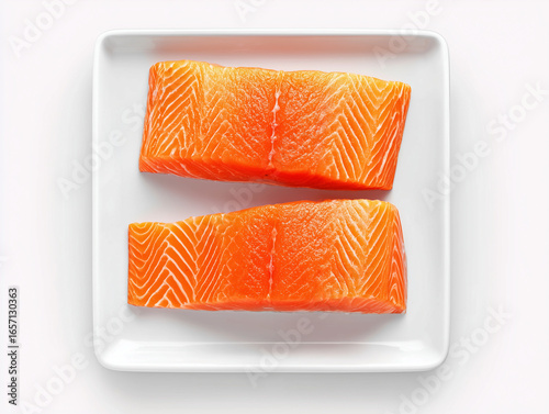salmon, fillet, fish, raw, fresh, food, healthy, seafood, protein, diet, cooking, cookery, ingredient, meal, omega 3, nourishment, delicious, epicure, white, plate, background, topview, dinner