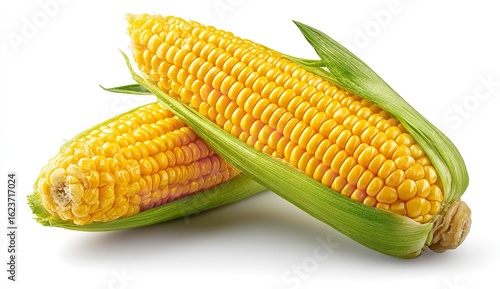 Two Fresh Yellow Corn on the Cob Isolated on White Background with Clipping Path and Hard Shadow