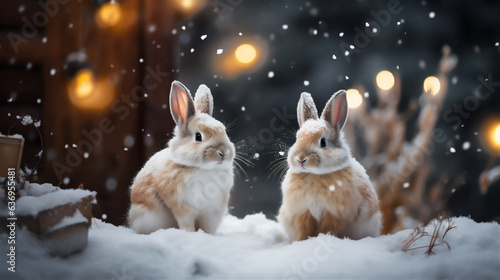 Two friendly rabbits against the background of snow and illumination