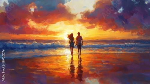 Two friends enjoying a sunset beach walk, golden light reflecting on the waves, vibrant colors in the sky, peaceful and joyful mood, ultra-detailed, high definition.