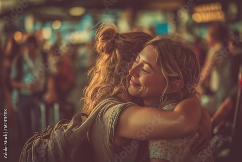 Two friends hug tightly at arrivals gate, emotional reunion among busy crowd