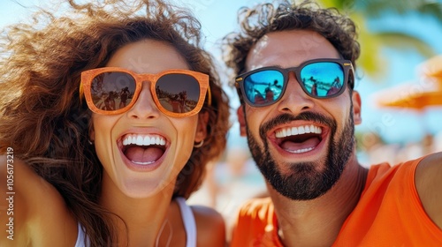 Two friends in colorful sunglasses are smiling widely while enjoying a lively day on the beach, embodying the carefree, fun-filled moments of summer.