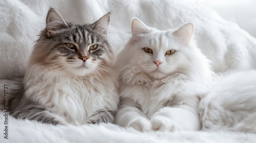 Two gentle cats peacefully cuddling on a soft blanket highlighting their beautiful fur textures and serene expressions.