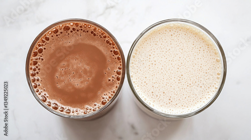 two glasses, chocolate milk and regular milk on white background. Delicious protein shakes in glasses on white table, closeup.