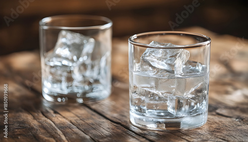 Two glasses filled with ice sitting on a wooden table, perfect for outdoor or rustic-themed events