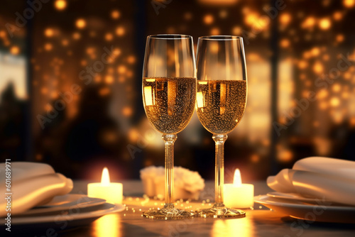 two glasses of champagne on a table with candles. Generative Ai