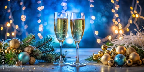Two Glasses of Champagne with Christmas Decorations, Blue Lights, Festive, Celebration, Holiday, New Year