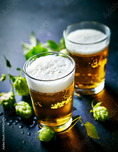 Two glasses of cold beer and fresh hops on black background. Copy space
