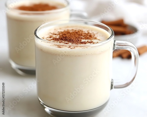 drink, beverage, creamy, white, liquid, glasses, cup, mug, cinnamon, spice, dusting, sprinkled, powder, warm, comfort, delicious, frothy, smooth, sweet, vanilla, favor, dessert, refreshment, close, up, side, clear, transparent, handle, healthy, breakfast, cosy, treat, texture, brown, food, kitchen, marble, surface, background, light, top, fresh, simple, homemade, aromatic