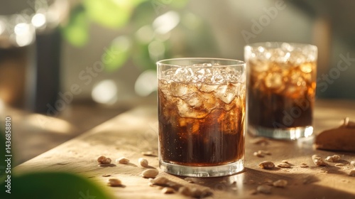drink, cola, beverage, ice, glasses, refreshing, cold, summer, brown, table, nut, snack, light, sunshine, bubble, carbonated, fizzy, crystal, clear, epicure, food, sweet, tasty, thirst, healthy, lifestyle, relaxing, still, life, closeup, overhead, top, view, wooden, surface, background, texture, natural, casual attire, scene, 2, goggles, serving, refreshment, cube