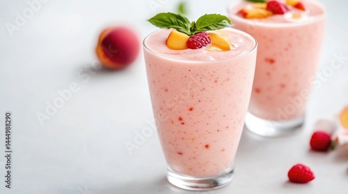 Two glasses of peach and raspberry smoothie, topped with fresh fruit