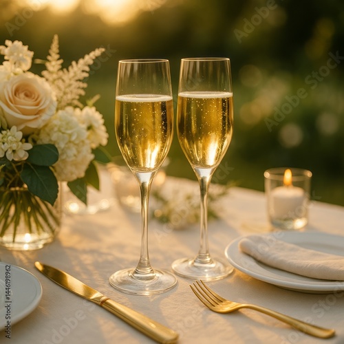 Two glasses of sparkling champagne on an outdoor table decorated with ivory roses and candles, under a bright blue sky with soft clouds. A romantic and festive daylight setting, perfect for weddings