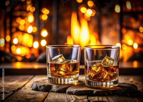 Two Glasses of Whiskey on the Rocks with a Bottle in Background - Warm Light and High Depth of Field for a Cozy Atmosphere