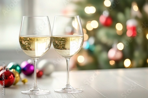 Two Glasses White Wine on Festive Table with Bokeh Christmas Decor - Shallow Depth of Field Daylight Setting
