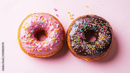 donut, glazed, sprinkle, pink, chocolate, dessert, sweet, food, bakery, breakfast, snack, calorie, sugar, tasty, delicious, treat, pastry, icing, colourful, food photography, topview, closeup, overhead, sugary, snack food, treat, sweet food, baking, confectionery, baked goods, pastry, donut, donut, epicure