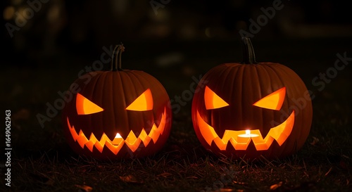 Two Glowing Jack o Lanterns Carved for Halloween Night Celebration