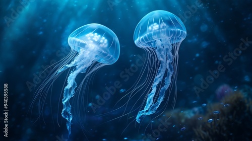 jellyfish, ocean, underwater, coral, fish, deep blue, semitransparent, marine life, calmness, nature, aquatic, aethereal, surreal, tentacle, sunlight, gliding, illuminated, vibrant, ecosystem, school, beauty, exploration, sea, marin, environment, biodiversity, harmony, shadow, colours, fluidity, motion, serene, tropical, ocean life, wave, tranquil, illumination, depth, pattern, wildlife, natural, serenity