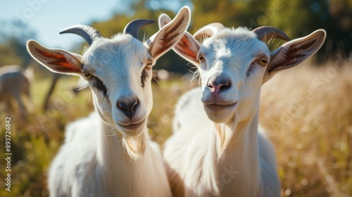 Two goats are standing next to each other in a field. One goat is looking at the camera while the other is looking away