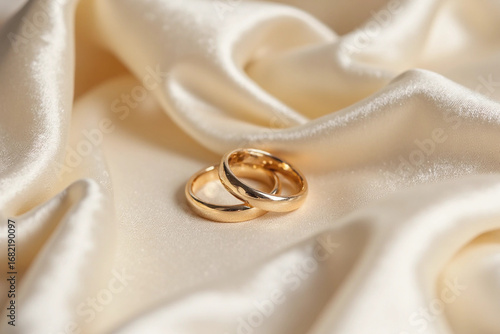 Two gold classic wedding rings lie on a chic satin fabric with soft pleats. Wedding background. 3d rendering.