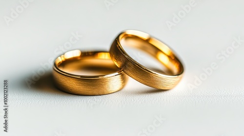 Two golden wedding rings resting on a white surface