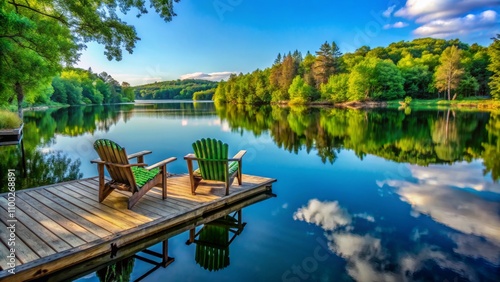 Two Green Adirondack Chairs on a Wooden Dock Overlooking a Lake with Reflections of Trees, Sky, and Clouds, lake , nature , landscape , reflection