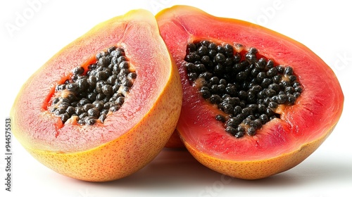 papaya, fruit, tropical, juicy, ripe, sweet, red, yellow, orange, seed, black, half, sliced, cut, fresh, healthy, delicious, food, snack, breakfast, dessert, vitamin, antioxidant, summer, exotic, vibrant, flesh, rind, texture, macro, isolated, photo, still life