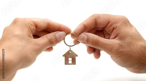 two hands are exchanging a key on a keychain that has a house on it background is white.