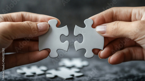 Two hands hold individual jigsaw puzzle pieces, symbolizing teamwork and collaboration in solving complex problems and finding solutions.
