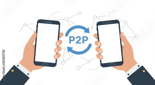 Two hands hold phones facing each other with a "P2P" symbol, representing direct data transfer. Abstract network lines