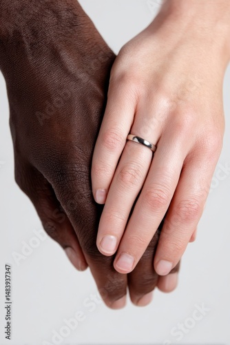 2, hand, holding, each, other, dark, skinned, man, fair, woman, both, wearing, wedding, ring, symbol, oneness, love, interracial, marriage, commitment, partnership, connection, harmony, diversity, equality, tenderness, affection, bond, human relationships, romance, togetherness, emotional, human, powerful, narrative, cultural, fusion, trust, devotion, strength, family, hope, celebration, joy, solidarity, ring, couple, engagement