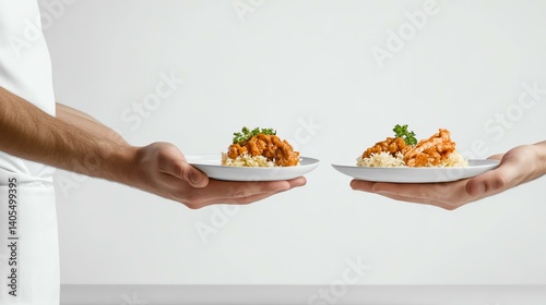 Two Hands Presenting Plates of Pasta with Tomato Sauce and Garnish