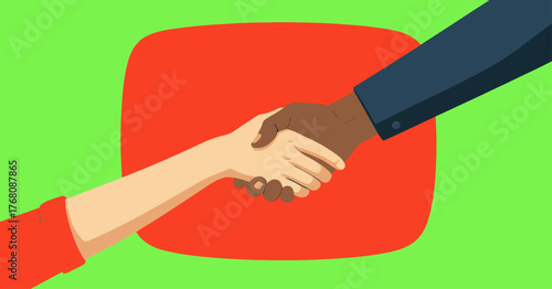Two hands shaking in flat colorful style over red shape, symbolizing partnership