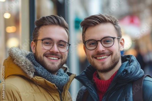 two happy boyfriends looking on the shopwindow while standing with shopping the mall