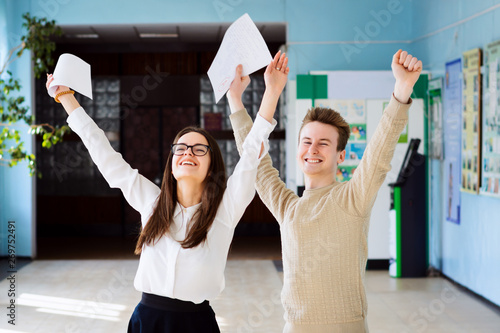 Two happy friends happy after researching their checked exams, raising hands up and expressing amusement of getting excellent grades for their work