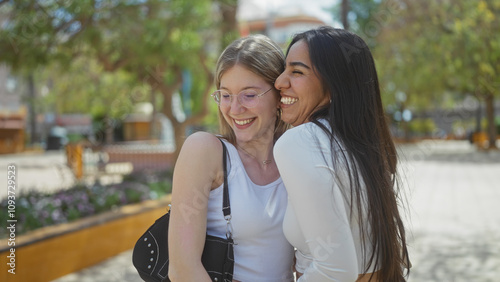 woman, friends, happy, embracing, laughing, sunny, urban, park, daytime, friendship, joy, happiness, smiling, casual attire, city, female, adult, togetherness, affection, companionship, bonding, human relationships, female, people, diversity, multicultural, lifestyle, leisure, recreation, relaxation, young, joyful, street, town, cheerful, goggles, diverse, generation, public, space, social, interaction, natural, light, feminine, scenery, tree
