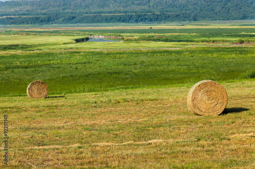 two hay bales in the green meadow valley