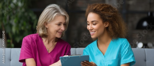 health care, professional, medicals, teamwork, discussion, clipboard, smiling, support, interaction, woman, consult, nurse, care, friendship, wellness, office, staff, diversity, communication, assistance, collaboration, happiness, trust, empathy, education, clinic, service, advice, consultation, health