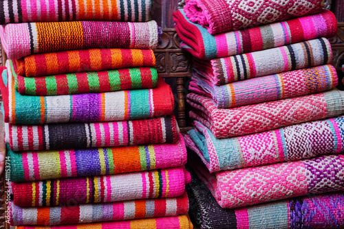 Two heaps of multi coloured traditional Peruvian woven textiles at a street market, Peru