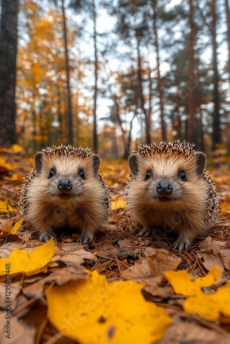 Two hedgehogs are sitting in the leaves in the woods