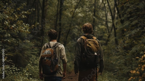 forest, hiking, man, walking, path, tree, foliage, wood, green, nature, adventure, exploration, travel, journey, scenery, landscape, cloudy, overcast, day, sunlight, shadow, perspective, back, rear, view, 2, friends, group, trail, activity, healthy, lifestyle, recreation, enjoyment, wilderness, wild, summer, spring