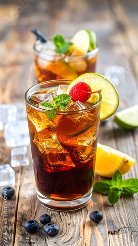 Two iced drinks, dark brown/amber colored, garnished with fruit slices and mint sprigs, on a rustic wooden table with ice cubes and blueberries