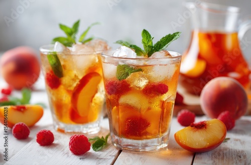 iced, ice, tea, drink, glasses, beverage, mint, garnish, fruit, peach, raspberry, cube, liquid, cold, refreshing, fresh, pitcher, table, white, wood, surface, slice, ripe, sweet, summer, refreshment, tabletop, still, life, nobody, container, homemade, juicy, ingredient, delicious, food, cookery, rustic, healthy, organic, natural, diet, closeup, macro, bright, light, clear, full, transparent