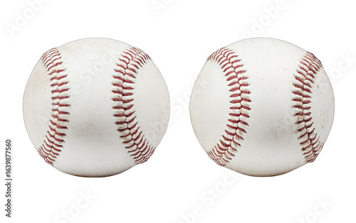Two identical baseballs, side-by-side, against a black background. Each ball is white with a distinctive red stitching pattern. The balls exhibit some minor wear or discoloration