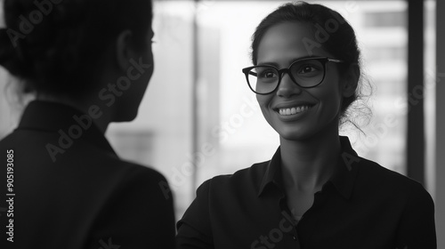 Two individuals in a professional setting, possibly an office. The person in the foreground, wearing glasses and a dark-colored shirt, is smiling and shaking hands with another individual