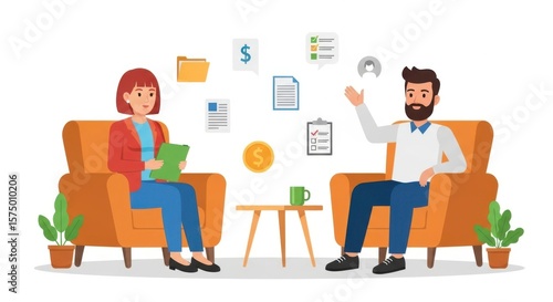 woman, man, armchair, folder, document, money, coin, clipboard, avatar, plant, table, illustration, cartoon, finance, business, meeting, review, agenda, chart, report, note, green, orange, blue, white, conversation, agreements, success, goal, strategy