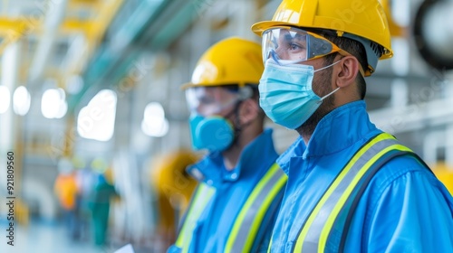Two industrial workers wearing safety helmets and masks, focused on their tasks in a modern factory environment.